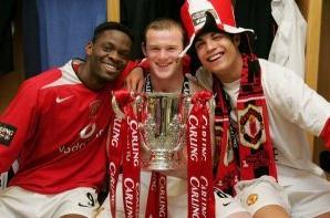 Happier times: Van Nistlerooy and Ferguson (left); Saha, along with Rooney and Ronaldo (right)