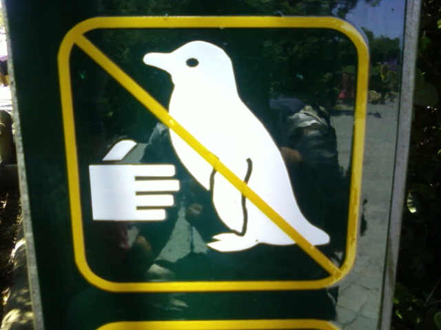 (Taken at Boulders Beach, Cape Town. Of course, the sign actually means you’re not to pet the penguins. They bite, apparently – so it could get nasty. Especially now that it’s mating season.)