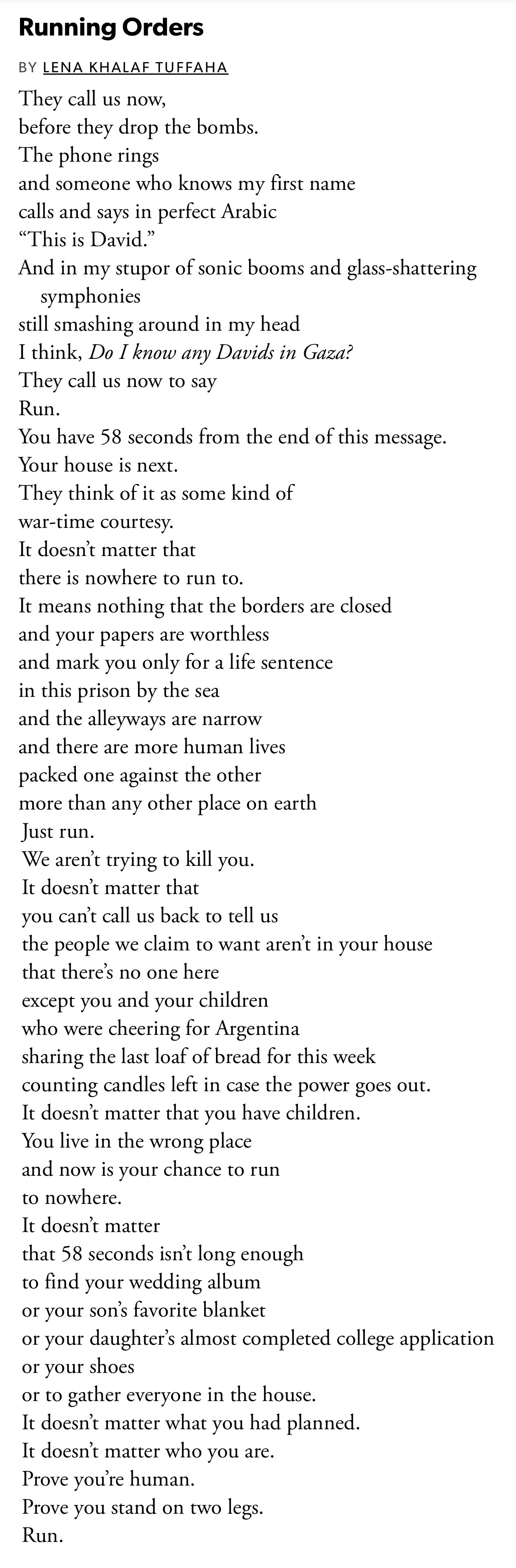This poem so perfectly captures the terror and panic of war, how we utterly transform ourselves into monsters and victims…I imagine it was much the same in the kibbutzes and gatherings on October 7, or in the London blitzes, Pearl Harbor, Hiroshima, the path of Genghis Khan, the Nazis, the Romans…or a single angry man with an assault rifle. As a species, we do not seem able to heal our impulse to destroy the gifts of existence and connection, or collectively gravitate towards the infinite potential of Love.
