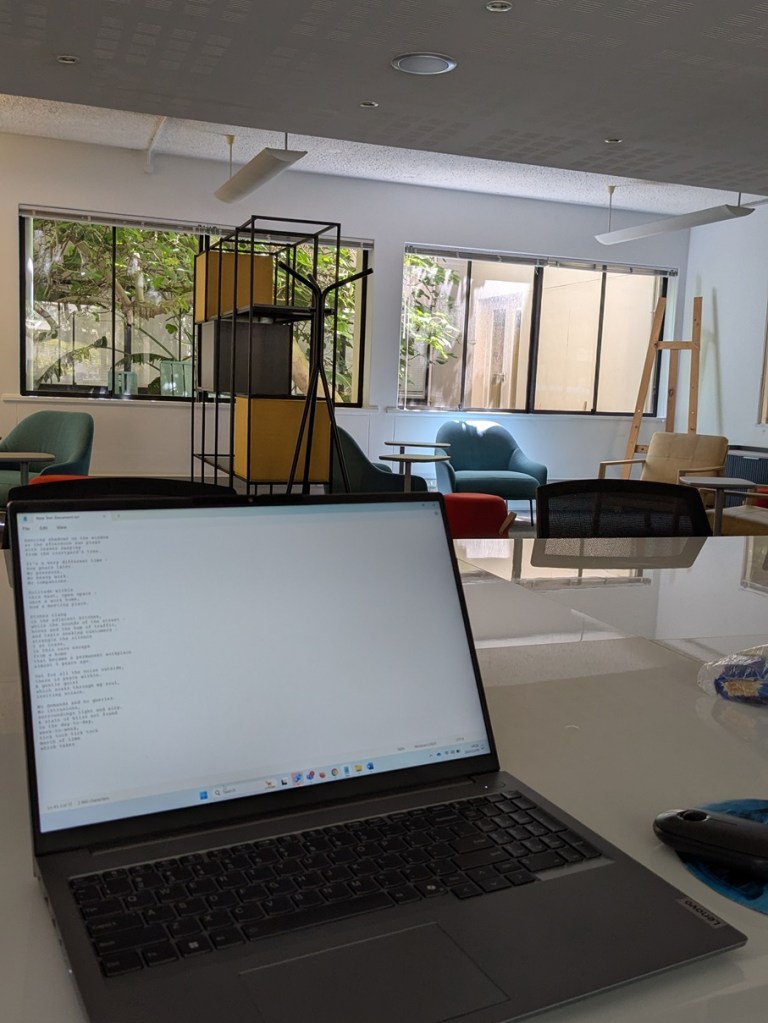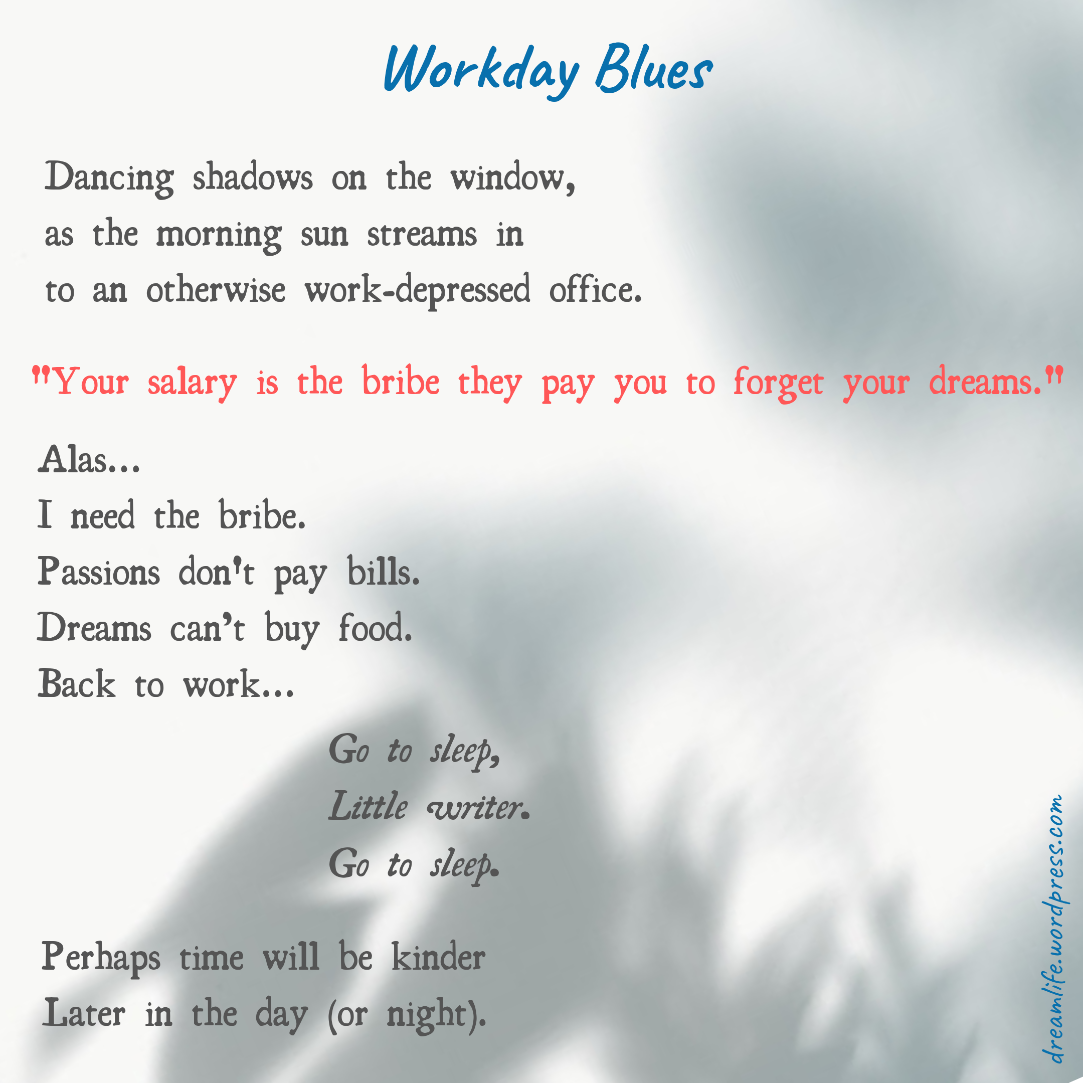 The poem entitled "Workday Blues" reads: "Dancing shadows on the window, as the morning sun streams in to an otherwise work-depressed office. 'Your salary is the bribe they pay you to forget your dreams.' Alas... I need the bribe. Passions don't pay bills. Dreams can’t buy food. Back to work…. Go to sleep, Little writer. Go to sleep. Perhaps time will be kinder Later in the day (or night)."