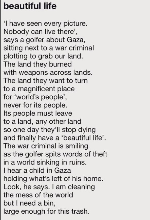 1. WordPress wouldn’t allow me to comment properly, Yacoob, but this needs to be shared wildly. The Golfer—he cheats at that, too—is an evil, grasping idiot and the world is paying for the tragic lack of integrity, morality, and logic his ignorant supporters have unleashed on the world. The people of Gaza need our help and love. That is all.