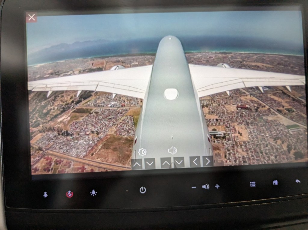 Fast forward to today, and you don’t have to be bored for even a second. On our Qatar Airways plane, each passenger (economy class, in case you’re wondering) had their own personal tablet built into the seat in front of them, with a personal choice of 8000 entertainment options (according Kevin Hart in the safety video). These options included a plethora of movies (in various categories and languages), TV shows, live TV, video games, full music albums, and podcasts. Being an Islamic nation’s carrier, it also included the Holy Quran – both to recite from the screen, and with a choice of audio recordings. There was also information about the destination (and other destinations the airline flies to), a 3D flight map with various views and sets of information, and live views from three cameras outside the plane. And if that wasn’t enough, there was also free, Starlink-provided WiFi to connect your personal device to, so you could remain in constant contact with those on the ground.