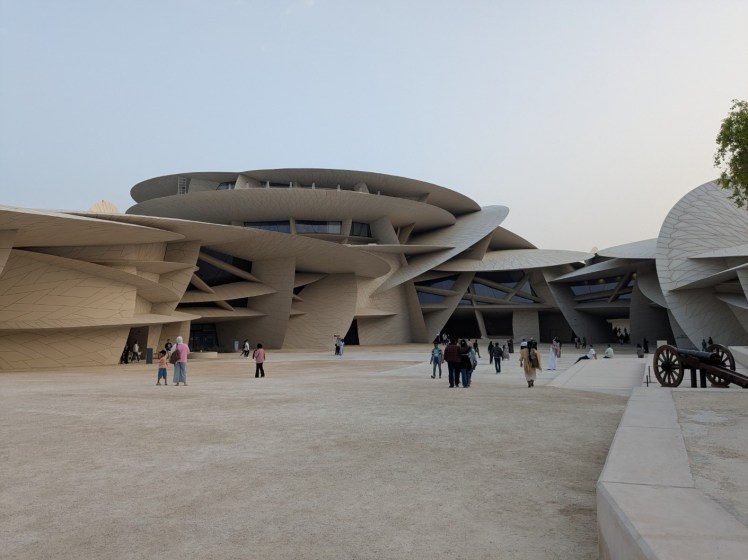 Our first activity was to visit the National Museum of Qatar, with its standout architecture (fashioned after the desert rose crystal formations in the nearby desert). The displays inside were impressive, showcasing the nation’s history (heavily tied to pearling, and later oil), and including items like TV sets from the 80s and rotary phones – which, I suppose, qualifies as a historical artefact to today’s kids (and another reminder of my rapidly-advancing years).