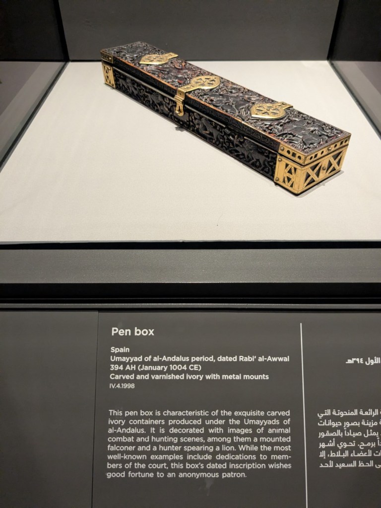 Some of the items on display included ancient texts, handwritten Qurans, jewellery, cooking utensils, and more. What stood out most for me were the numerous ornate pen boxes, highlighting the prominent position of writing in Islamic civilisation, historically.