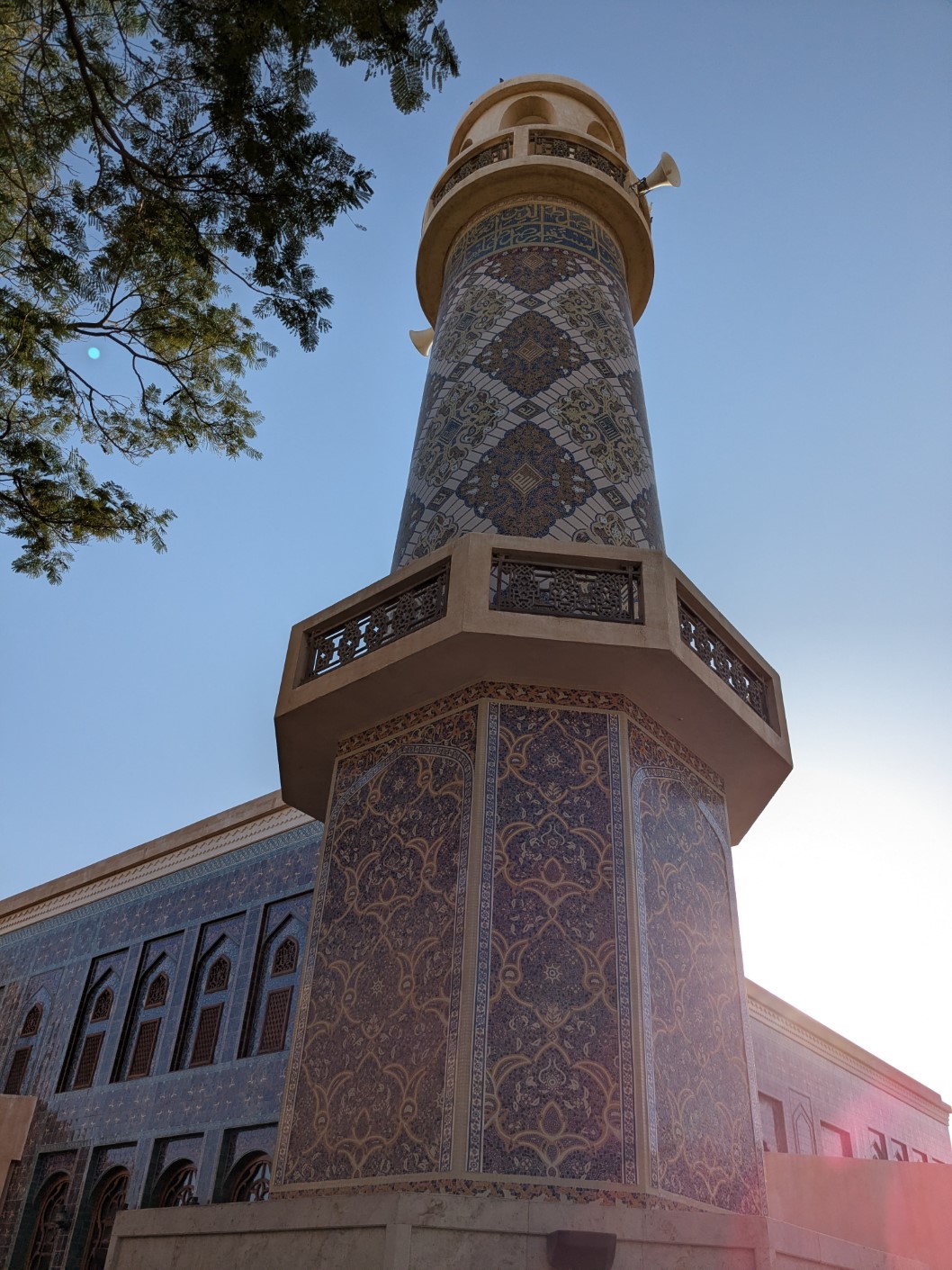 The next day, we briefly walked through a marketplace – Souq Waqif (which we visited later that evening) – before heading to Katara Cultural Village, where we spent some time on the beach (which felt more like a bay, actually). I was delighted to find Indian Mynas – a bird which was very common where I grew up (though they’re not pleasant creatures – being classified as an invasive species). We also walked briefly through some of the ‘village’ (mostly high-end shopping) while trying to find the Katara Mosque, which had some cool, Timbuktu-styled pigeon towers outside.