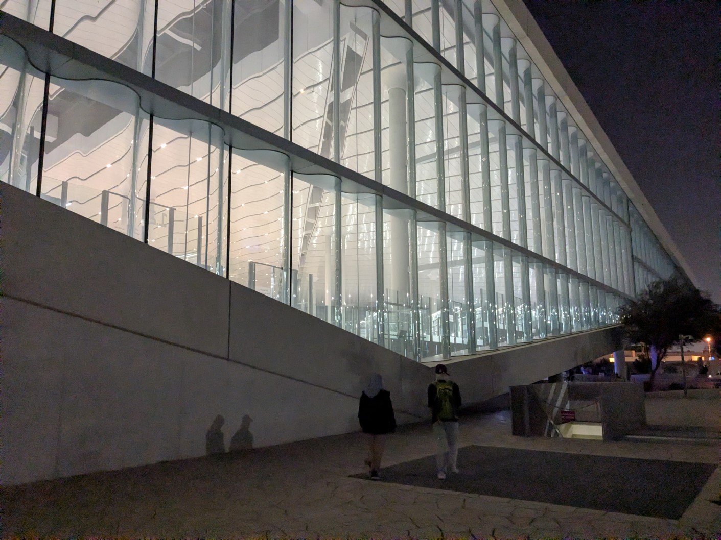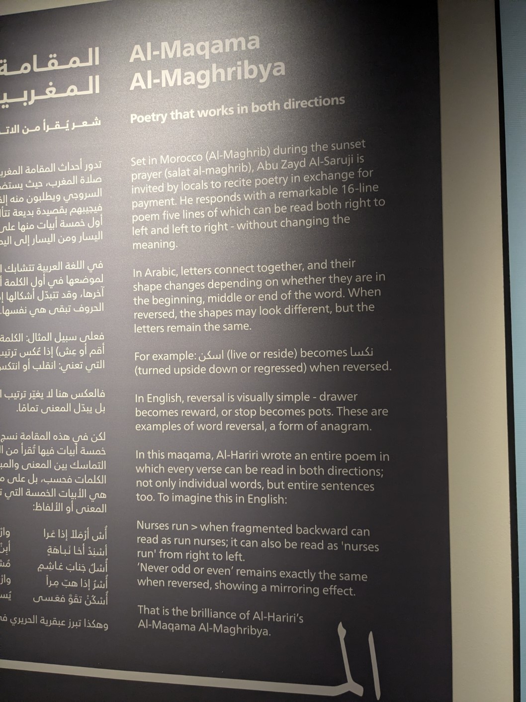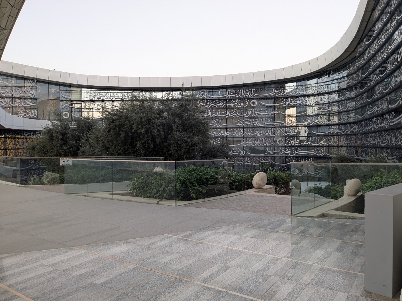 The Education City area is made up of 12 square kilometres, housing numerous institutions, including satellite campuses of eight international universities. Fittingly, it also includes the vast Qatar National Library, which is a dream for book lovers and knowledge seekers. As non-residents, we obviously couldn’t take any books out, but it was an absolute pleasure walking around the many levels and areas of this incredible institution. (Check out this walking tour if you’re curious.) It included a museum display on Arabic literature, including a section on the Maqāmāt al-Ḥarīrī – which includes an entire poem where every verse can be read in both directions.