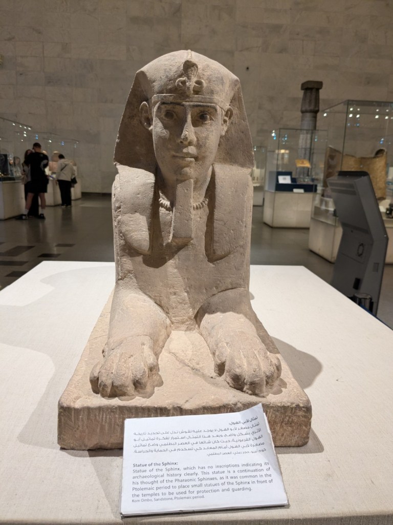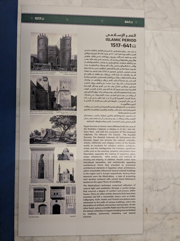 Next up was the National Museum of Egyptian Civilization, where the primary attraction was the Royal Mummies Gallery, which was dimly lit, with no photography allowed, and quietness enforced (so I have no photos to show). The area houses the mummies of 17 Kings and 3 Queens of ancient Egypt, including Ramses II, who some believe (though it hasn’t been 100% proven) was the tyrannical pharaoh at the time of Prophet Moses (peace be upon him). The bodies – however remarkably preserved – were gross, but seeing them like this – these kings and queens who ruled so grandly – should serve as a reminder to today’s tyrants of the fate that awaits them.